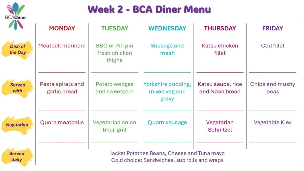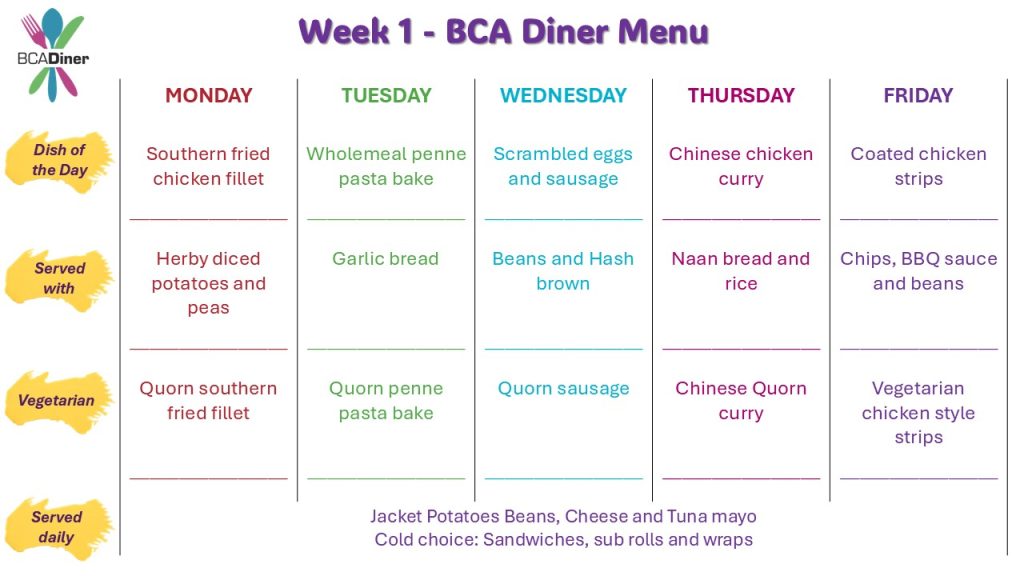 We are proud to offer a vibrant and welcoming dining experience that caters to all tastes and dietary needs. Our main BCA Diner, with a seating capacity of over 300 students, provides a comfortable space for pupils to enjoy freshly prepared, nutritious meals every day.